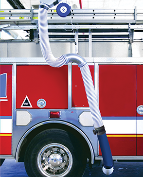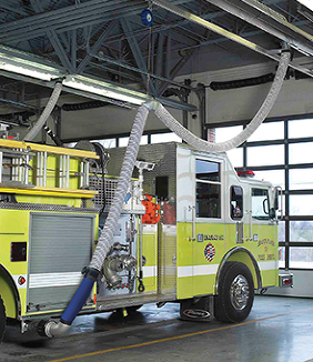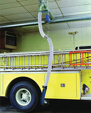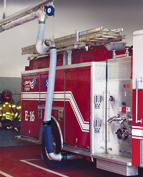 Systems are fully automatic and won’t slow down boarding time. When the engine starts, auto-sensor activates the exhaust fan. The fan runs for three minutes and automatically shuts off. (Manual override is used when the engine needs to run longer, such as during engine tests.) Nozzle stays connected as the apparatus exits the bay, then automatically releases at the door. The balancer cable gently retracts the hose/nozzle assembly away from the door.